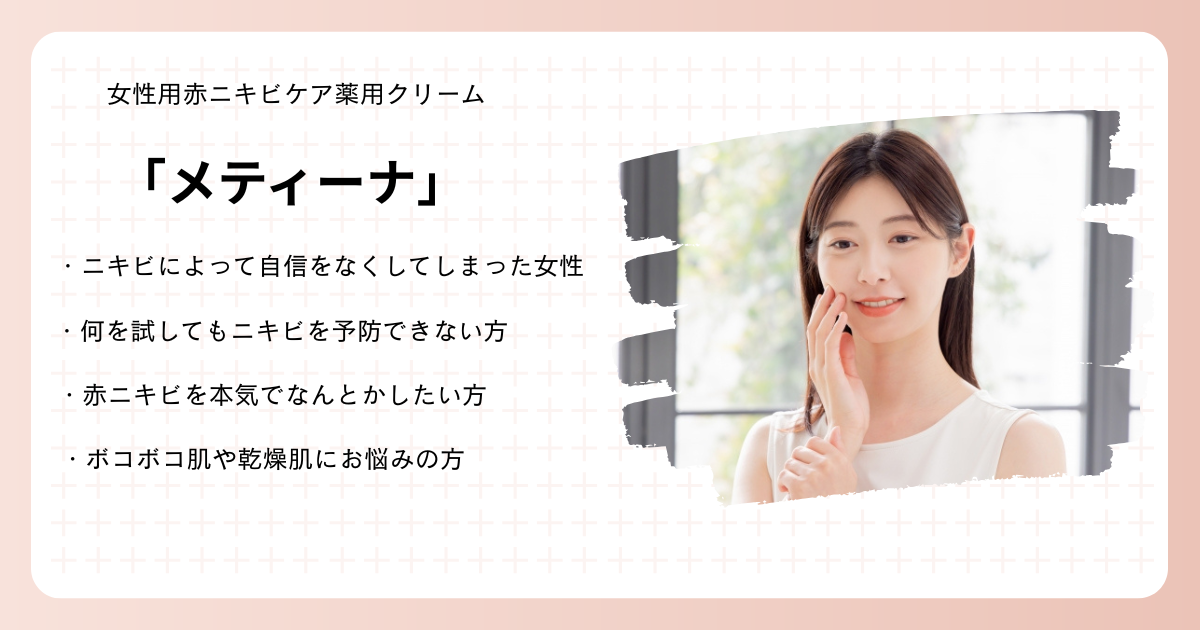赤ニキビやニキビ跡がなかなか治らず、「何をしても繰り返す」「マスクを外すのが怖い」という声は少なくありません。特に20代後半から30代にかけては、ホルモンバランスやストレス、生活習慣の乱れなどが原因で大人ニキビ(赤ニキビ)に悩む女性が増えています。そんな中、SNSや口コミで注目を集めているのが、女性用赤ニキビケア薬用クリーム「メティーナ(METINA)」です。抗炎症・美白・高保湿を同時に叶える医薬部外品として、多くの利用者が「赤みが落ち着いた」「跡が薄くなった」と効果を実感しています。