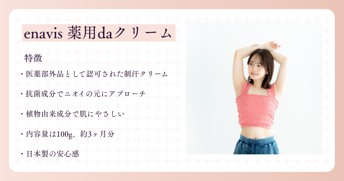 このように、制汗・消臭・スキンケアをトータルでカバーしているのがenavis 薬用daクリームの大きな特徴といえるでしょう。