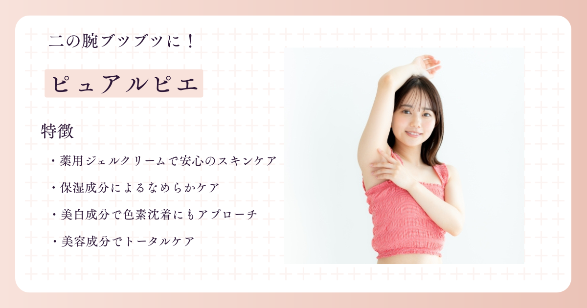 そんなコンプレックスを抱える方のために開発されたのが、薬用ジェルクリーム「ピュアルピエ」です。保湿・美容・美白成分を配合し、二の腕の肌をなめらかに整えると話題になっています。