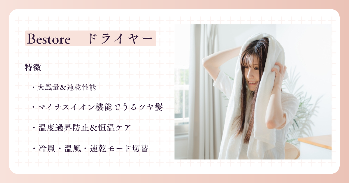 Bestoreドライヤーは、「速乾・軽量・コンパクト」という3つの特徴が強みのドライヤーです。