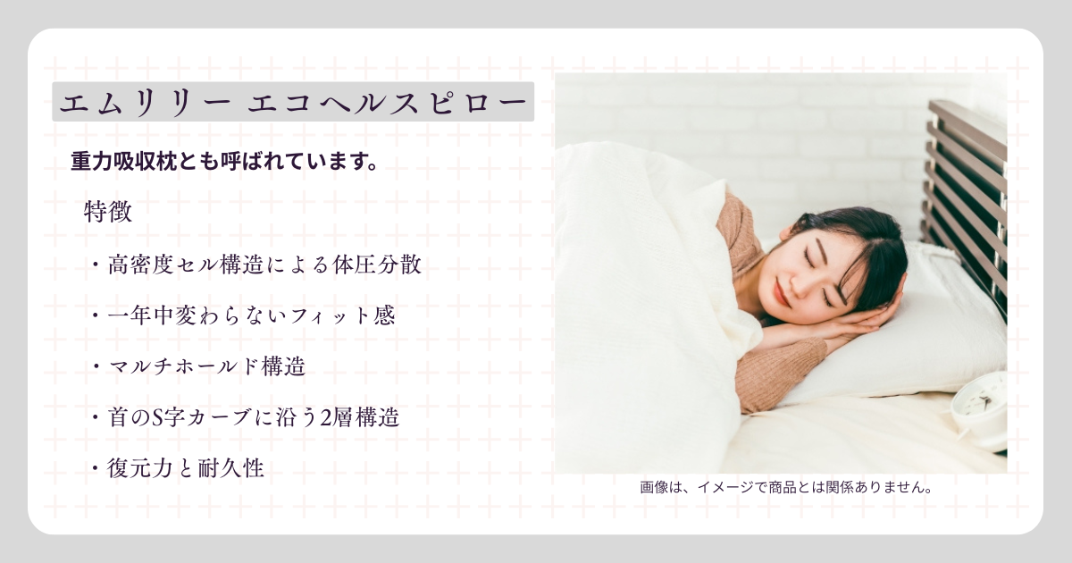 エムリリー エコヘルスピローは、「重力吸収枕」としてクラウドファンディングで注目を浴びた高機能枕です。
