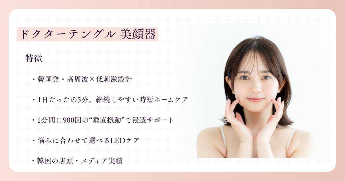 フェイスラインがぼやけて見える、手持ちのスキンケアが浸透しにくくなった、シミやくすみが気になる——年齢や生活習慣による肌悩みは、人それぞれ違っても「手応えのあるホームケア」を求める思いは同じです。そこで注目を集めているのが、韓国で約4年の研究を経て開発された高周波美顔器「Dr.tengle(ドクターテングル)」です。