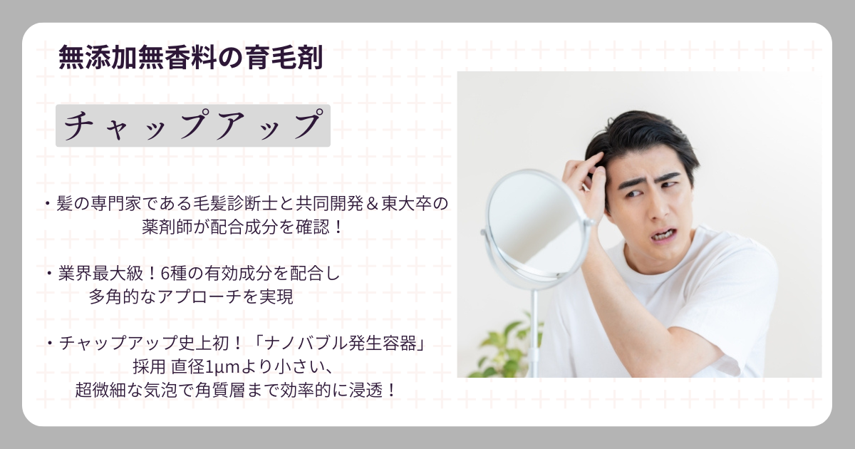 薄毛や抜け毛が気になりはじめると、多くの人が育毛剤を検討します。その中でも知名度が高いのが、無添加・無香料を特徴とする育毛剤「チャップアップ」です。