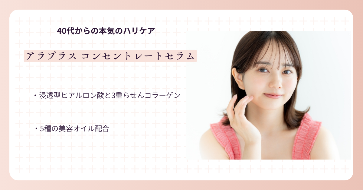 アラプラス コンセントレートセラムは、「角質層をしっかりうるおすことでハリ感をサポートする設計」の美容液です。ALAを中心に、浸透型ヒアルロン酸や3重らせんコラーゲン、5種の美容オイルが配合されており、乾燥が進みやすい40代以降の肌を保湿面から支える構造になっています。